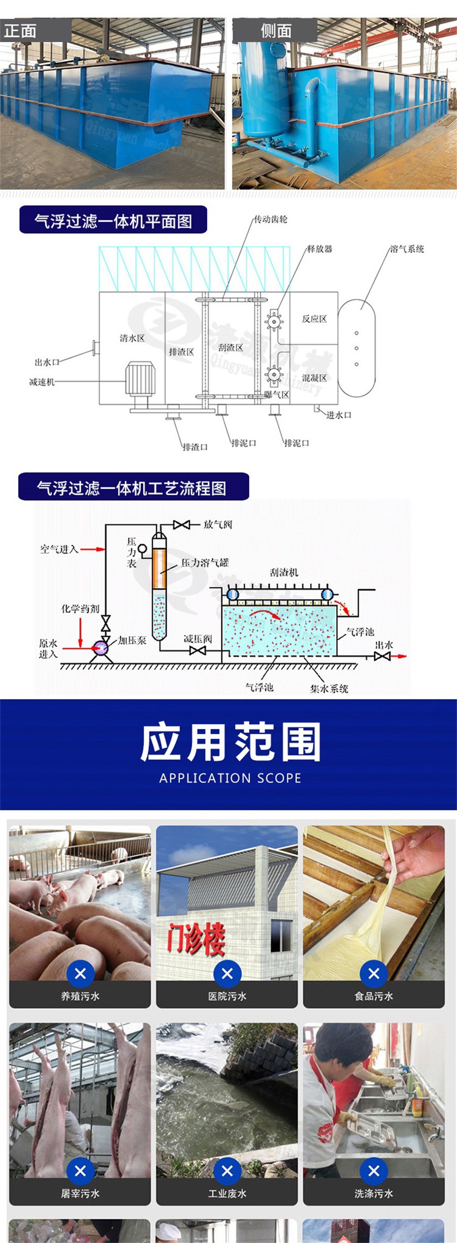 氣浮過濾一體機主要適用于處理廢水經(jīng)反應(yīng)后絮體比重接近于水的各類廢水,氣浮過濾一體機廣泛應(yīng)用于機械、化工、輕紡、交通、食品等行業(yè),特別適用于油田鉆井污水、油田回注水、煉油廠污水的處理。本機主要處理工藝采用物理化學(xué)法。將化學(xué)法、氣浮法、過濾吸附法等傳統(tǒng)成熟工藝經(jīng)過有機組合設(shè)計而成。具有工藝簡單合理、適應(yīng)性廣、結(jié)構(gòu)緊湊、運輸安裝方便、操作簡便、性能穩(wěn)定可靠的特點。對油水分離,懸浮物、COD、BOD的去除有很好的效果,一般廢水經(jīng)處理后都能達到排放標準。