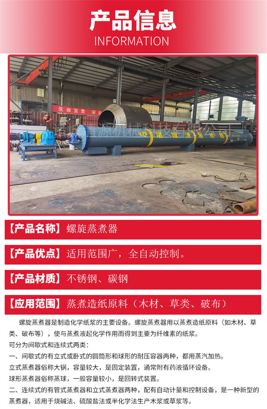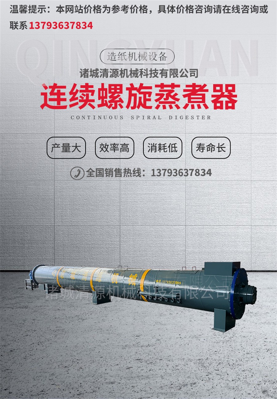 諸城清源機械科技有限公司生產的螺旋蒸煮器用以蒸煮造紙原料(如木材、草類、破布等),使與蒸煮液起化學作用而得到主要為纖維素的紙漿。